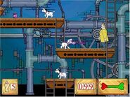 Activities include a virtual adopt-a-puppy at the Second Chance Dog Shelter, where the player can choose and care for any one of the four dogs Chomp, Domino, Digger, and Drooler by giving them a name, to be their companion as they tour six international parks from London to Tokyo. Before they can enter, the player can click on the right door if they have an Internet connection, or on the left door if they do not have an Internet connection. In Chow Time, the player has to help Kevin feed all 102 hyperactive and hungry puppies before they mob the kitchen. If three of them go in the kitchen, the game is over, in Operation: Dalmatian, the player must gather clues from the Parisian Twilight Bark gang to find the top dog to help find the stolen puppies, and have to find the correct dog with the color, size, country, fur and ear types. Once the player finds the correct dog, they will use a stamp, and to hear Waddlesworth, the player can press the button on the police radio. Once it is complete, Waddlesworth will award the player with a police badge. In the Verdogo game in Le Pelt's bakery the player helps Oddball by saving all 102 puppies from Cruella and her evil gang by using different weapons like frosting, butter or the jelly squirter and to regain lost energy with dog food. Once all of the puppies are rescued, Cruella will fall into the cake batter. If she gets caught, or if she runs out of energy, the player loses the game. In the pup art gallery, the player can make works of art with both classical and contemporary creations. The player will also make cards, use patterns and stickers of various dog breeds and characters and can print and save their work. Within the game, the Dalmatian puppy appears on the bottom right of the screen where the player can click out to exit a game, and there are two maps that the player can access different activities by learning facts and identifying local monuments in London and Paris and will also print them out. To go to Paris, the player can click on the blue train and returning to London by clicking on the purple train. To quit the game, the player can click on the double-decker bus.