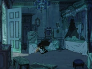 The interior of the mansion clearly shows the degradation and decay as much as the outside. Ragged curtains, crumbling doors, dust sheet-covered furniture, a towering suit of armor, eerie silence and cracked drywall all create a foreboding atmosphere that would deter any intruder. Due to its decayed state, the manor' structure appears to be very sensitive to damage and loud noises, as seen when Cruella slams the door of the lounge so hard that it caused the wall to crack and a piece of dry wall ceiling to fall on Horace. This is seen more prominently when Horace after getting his rear set on fire runs him and Jasper into a wall, causing the ceiling above to collapse onto them.