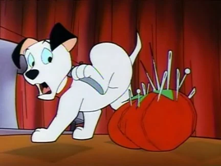 In the sauna, Lucky is mistaken as a sponge and is used to scrub Cruella's feet, and before he can be used between her toes, Lucky runs back to the farm.